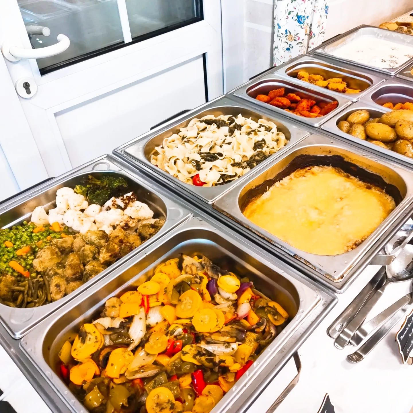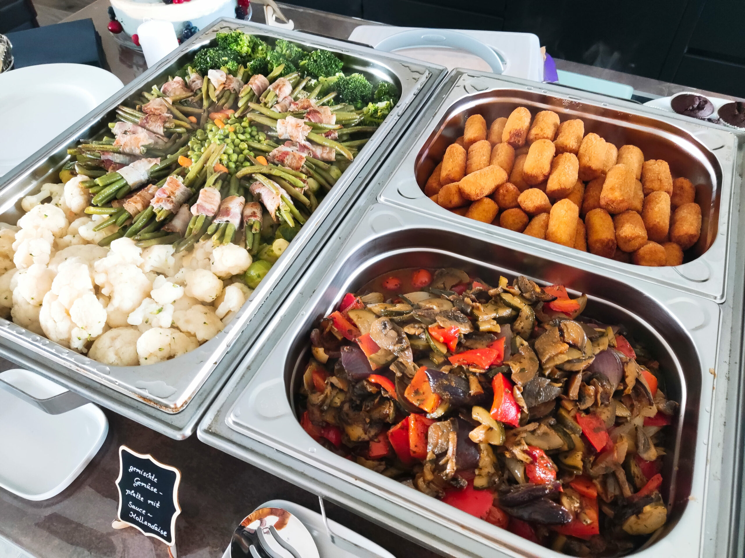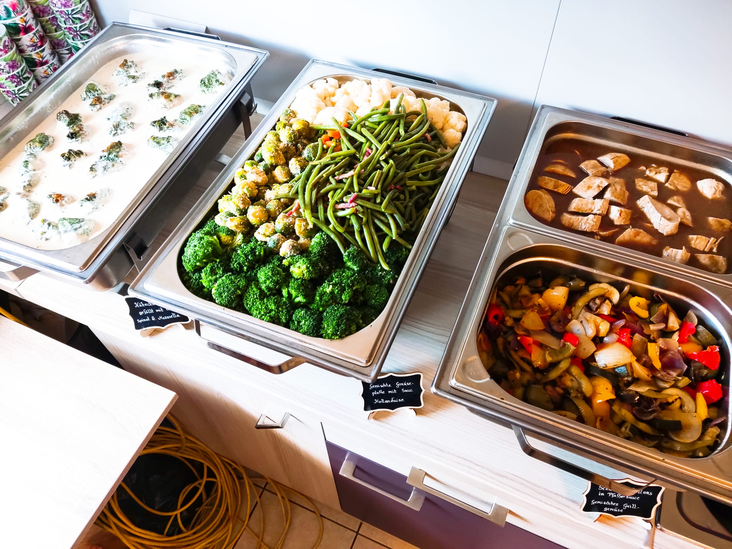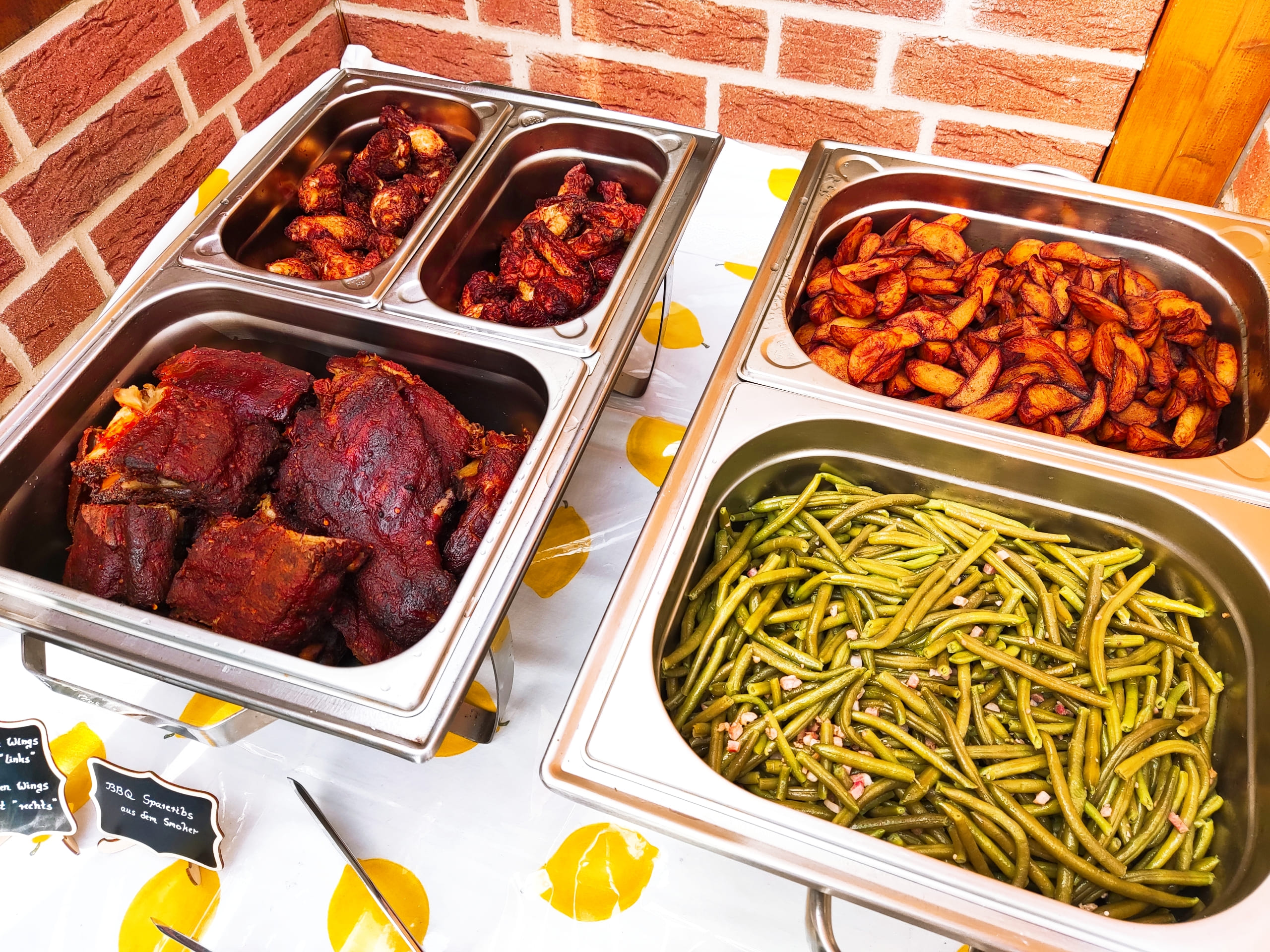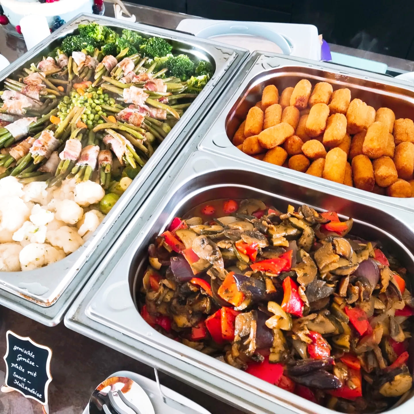 Runden Sie Ihr Buffet mit frischen und liebevoll zubereiteten Beilagen ab. Wählen Sie aus Rosmarinkartoffeln, Bratkartoffeln, Brokkoli mit gerösteten Mandeln oder gemischtem Ofengemüse – jede Beilage ist ein Genuss.